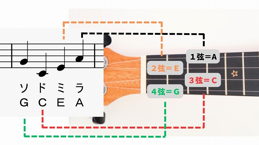 ウクレレの各弦はG、C、E、Aの音に合わせます。
