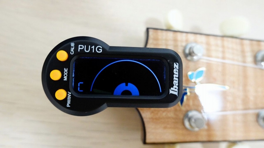 そこさえ押さえておけば、ペグを緩める(音が低くなる)か巻き上げる(音が高くなる)ことで音程を調整できます。表示がぴったりと真ん中にくるようにすればOKです。