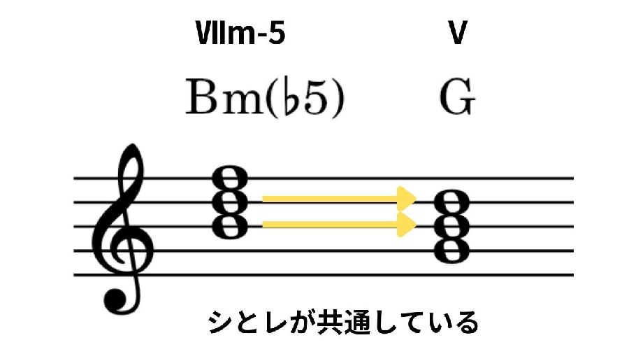Ⅶm(♭5)=Bm(♭5)も、上の図の通りⅤ(G)との共通音(シ・レ)をもち、Ⅴの代理コードとして機能します。
