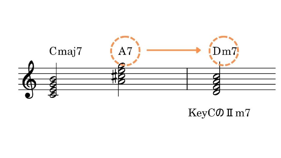 このセカンダリードミナントセブン自体は代理コードではありませんが、以下の章で見るように、セカンダリードミナントセブンを代理コードに置き換えることができます。
