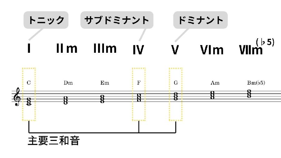 キーCで考えると、調性内三和音(ダイアトニックトライアド)は上の通り。その中で、主要三和音(スリーコード)はC、F、Gの3つです。