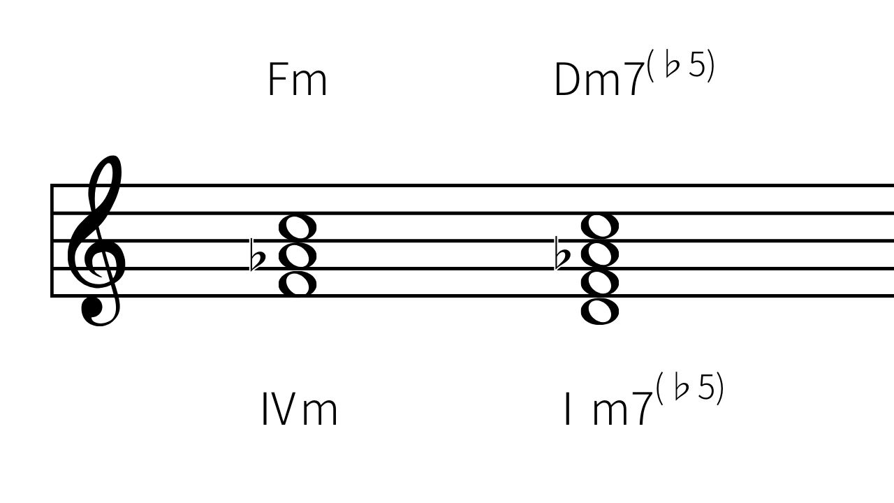 この場合、ファ・ラ♭・ドの音が共通していますが、Dm7(♭5)にはFmにないレの音が含まれており、やや不協和な音になるという特徴があります。