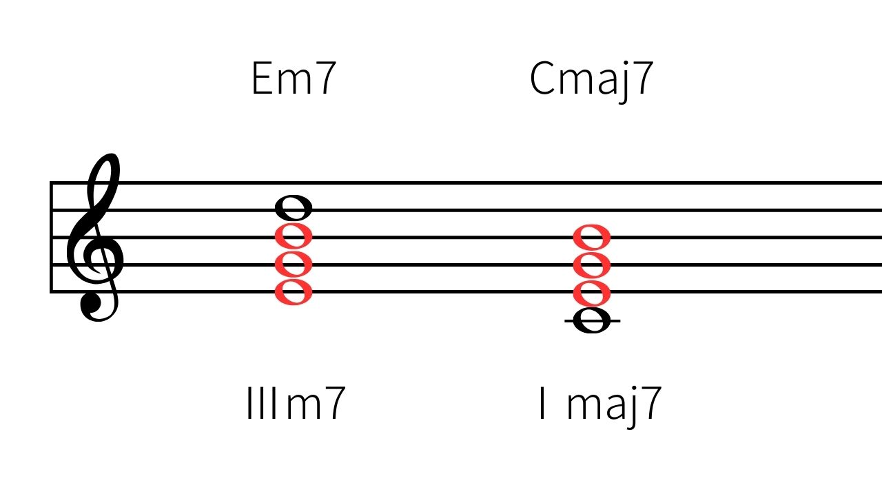 キーCで考えると、Em7(Ⅲm7)はトニックのCmaj7(Ⅰmaj7)とミ・ソ・シの音が共通しているため、代理コードとして使うことができます。 ただし、Em7は主音であるドの音を含まないため、終止感が薄れる傾向があります。