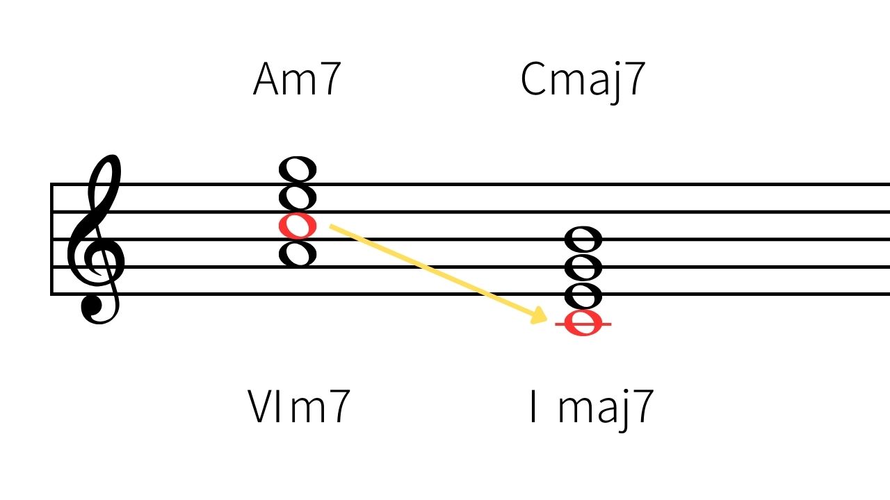 Ⅵm7(Am7)をⅠmaj7(Cmaj7=トニック)の代理として使う、というのが、おそらく最も多用される代理コードの使い方でしょう。