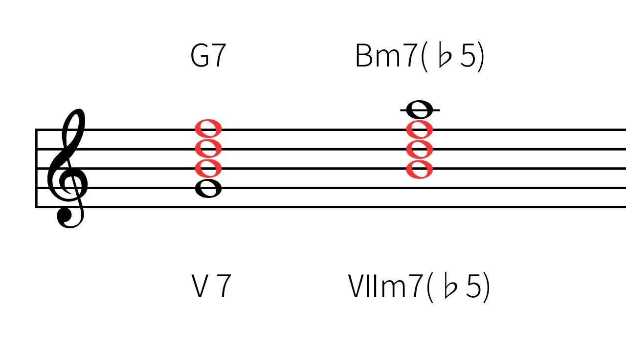 Ⅶm(♭5)=Bm(♭5)も、上の図の通りⅤ(G)との共通音(シ・レ)をもち、Ⅴの代理コードとして機能します。