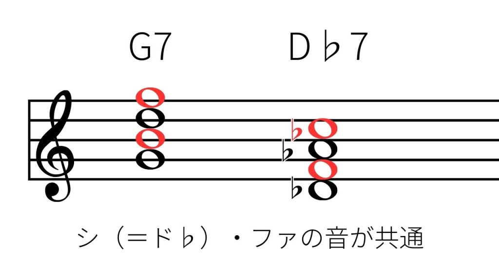Bm7(♭5)はドミナント(G7)とシ・レ・ファの音が共通しているため、代理コードとして使うことができます。
