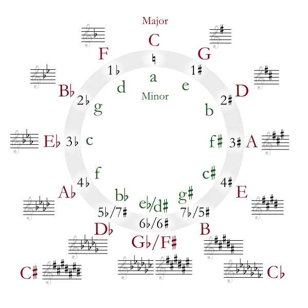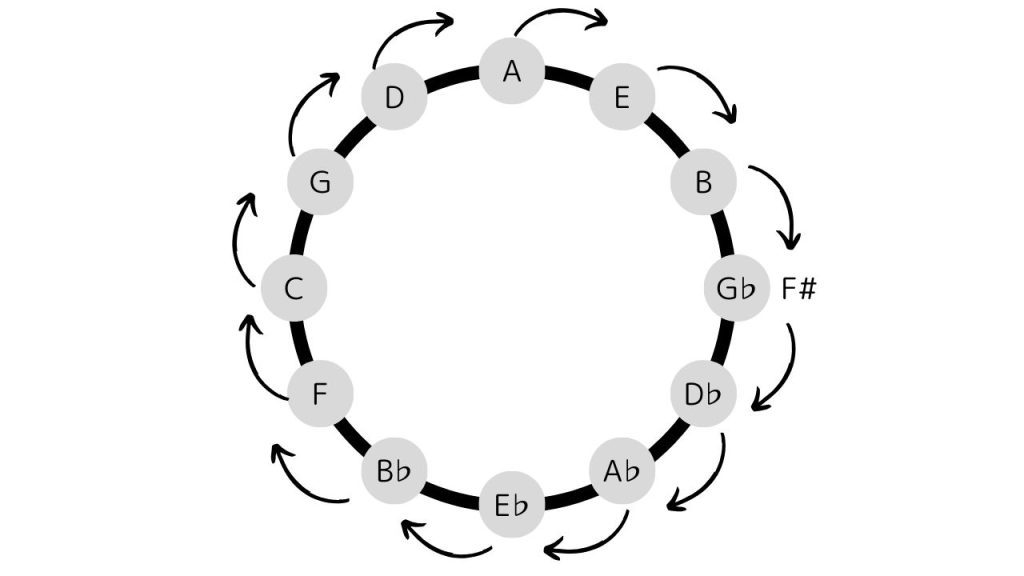 また、完全五度ずつ下行するドミナントモーションを続けることで、五度圏表を作ることができます(上の図)。
