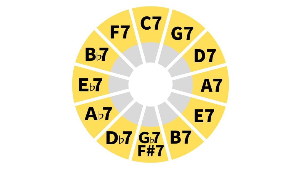ひたすらドミナントモーションを続けると、完全五度の輪ができ、最終的にもとのコードに戻ってくるということです。